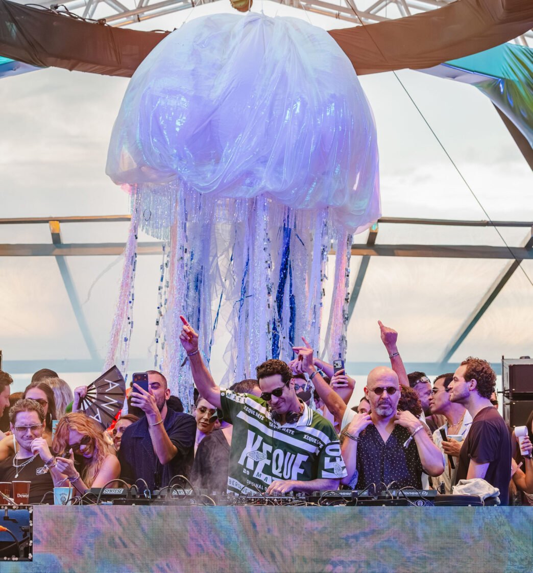 A pista, desde os primeiros momentos, já pulsava com uma energia distinta. A curadoria musical, um dos pilares da Água Viva, conduziu a jornada sonora com inteligência e sensibilidade. Os DJs que passaram pelo line-up entenderam o espaço e o público, construindo sets que evoluíam de forma natural, criando tensão, respiro e euforia nos momentos certos. A música não era apenas o centro da experiência, mas um elemento que se entrelaçava com a luz, com o cenário e com o movimento coletivo, criando uma sensação de imersão completa.