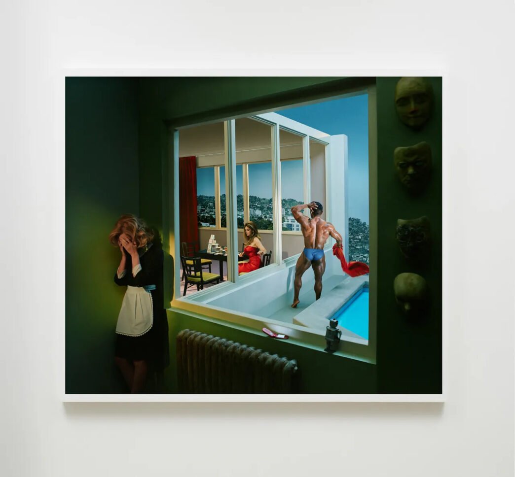 A Lehmann Maupin apresenta novas obras de Alex Prager que aprofundam sua estética cinematográfica e suas composições narrativas. Uma das imagens exibidas articula personagens que se observam através de janelas e superfícies refletidas, criando tensão e ambiguidade. A fotografia combina teatralidade, iluminação calculada e uma direção de cena precisa que transformam o momento capturado em um instante de história suspensa.