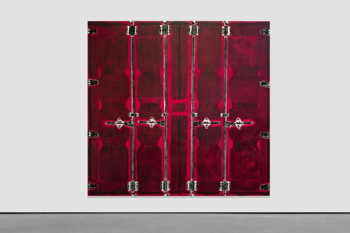 Nicole Coson utiliza portas de contêineres como matrizes de impressão para criar telas marcadas por circulação, trabalho e identidade. As composições carregam gestos corporais e rastros de deslocamento global.