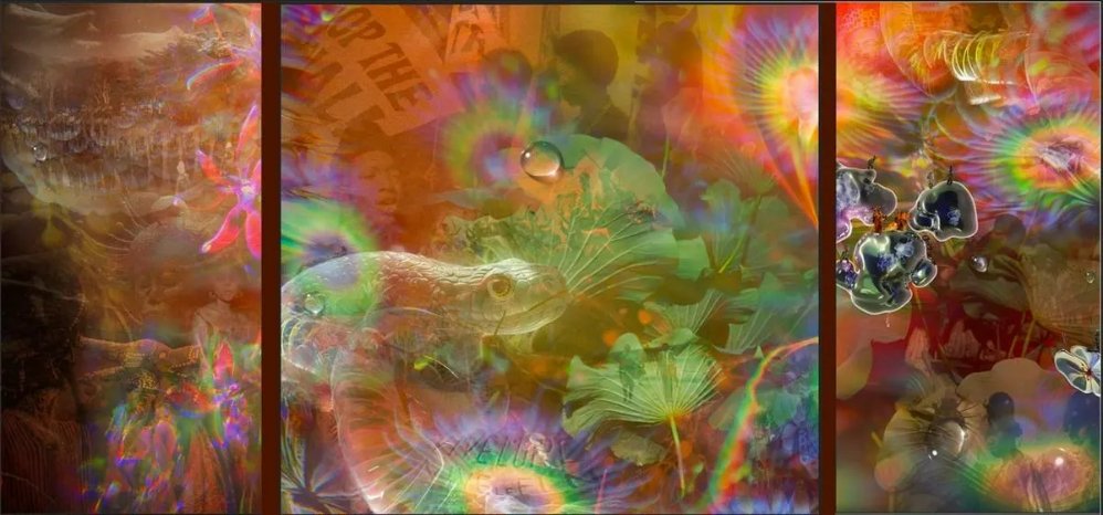 Josèfa Ntjam expõe um tríptico baseado em fotomontagens que combinam arquivos históricos, ficção especulativa e referências afro-diaspóricas. As imagens se desdobram em camadas que cruzam mito, memória e projeção.