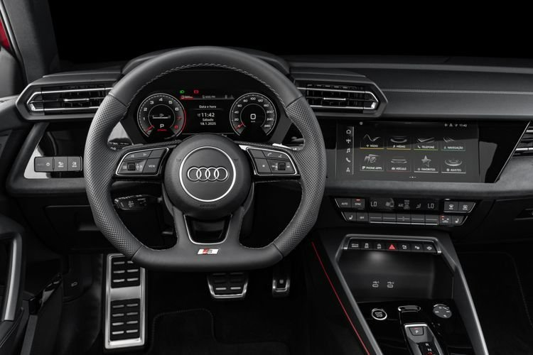 A cabine é um dos pontos altos do A3 Sedan. Os materiais escolhidos transmitem sofisticação, com superfícies macias ao toque, detalhes em preto brilhante e acabamento preciso. A posição de dirigir é baixa e facilmente ajustável, o que favorece a integração entre condutor e carro. O volante de base achatada inspirado no R8 entrega ótima empunhadura e reforça a esportividade. Os bancos dianteiros possuem ajustes elétricos, aquecimento e excelente apoio lateral, mantendo o conforto mesmo em longos percursos. O painel digital de 12,3 polegadas dialoga com a central multimídia de 10,1 polegadas, intuitiva e compatível com Android Auto e Apple CarPlay sem fio. Entre os destaques de conveniência, estão o carregador por indução, entradas USB-C, som Sonos 3D de 680 W e teto solar.
