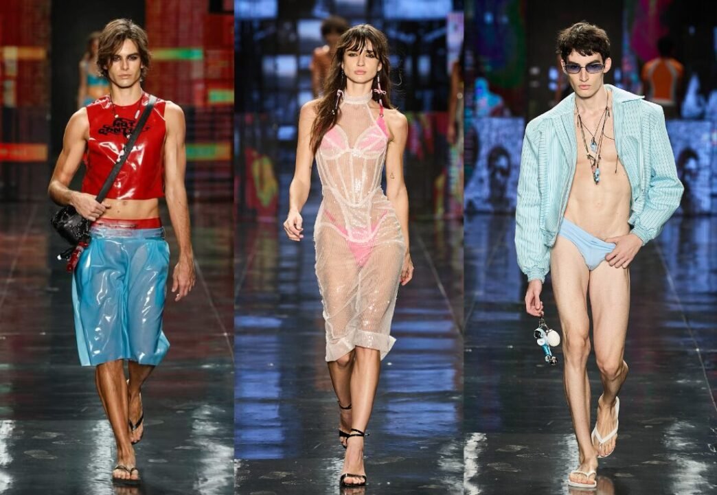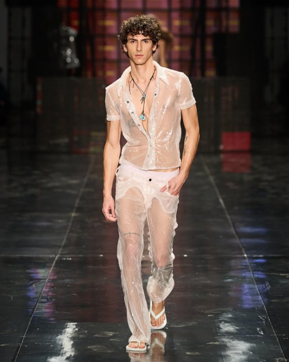 Peu Andrade, que levou sua moda clubber e fetichista à praia, revelou uma faceta mais leve sem abrir mão da intensidade que define seu trabalho. Entre microssungas, biquínis cortininha, bermudas de surfe e vestidos de paetês transparentes, o designer mostrou que o verão pode ser tão sensual quanto urbano, tão real quanto virtual, um espelho luminoso da geração que vive entre o toque e o pixel.