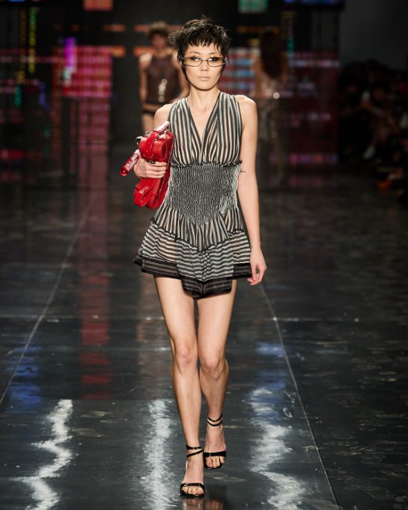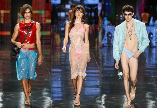 A cenografia transformou o desfile em um espetáculo imersivo. Telas e projeções exibiam imagens híbridas, entre registros reais e criações virtuais, criando um ambiente vibrante que espelhava a conectividade contemporânea. Apesar do atraso no início, que se tornou assunto nos bastidores, o impacto visual e conceitual do show superou as expectativas e reafirmou a identidade provocadora da marca.