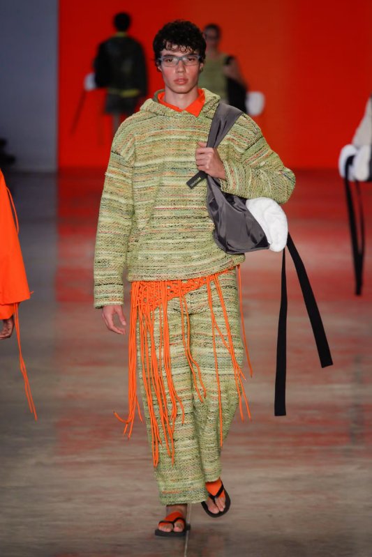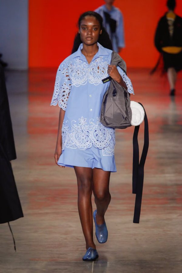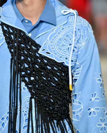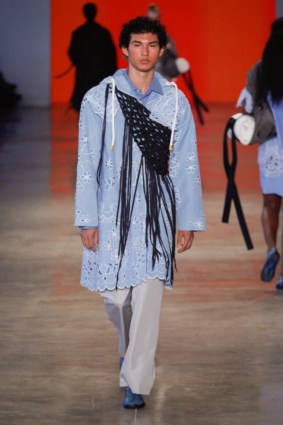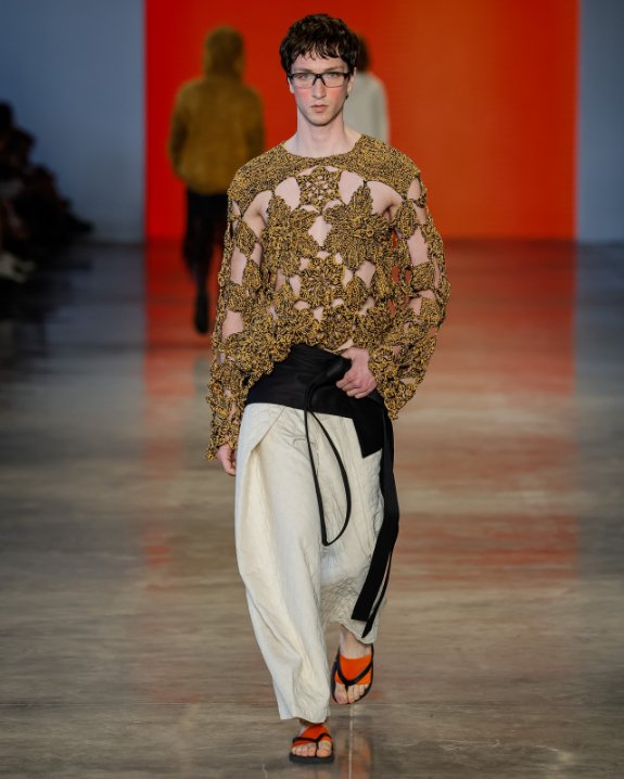 Reconhecido por sua pesquisa em crochê, produzida por quatro artesãs de sua terra natal, o estilista amplia o repertório nesta temporada ao incorporar a renda richelieu, técnica tradicional do Ceará. A partir de toalhas de mesa antigas, ele criou parkas e jaquetas esportivas que reconfiguram o significado do artesanal, provando que a herança doméstica pode dialogar com a estética contemporânea. Cada peça carrega um gesto de transformação, convertendo o comum em sofisticado.