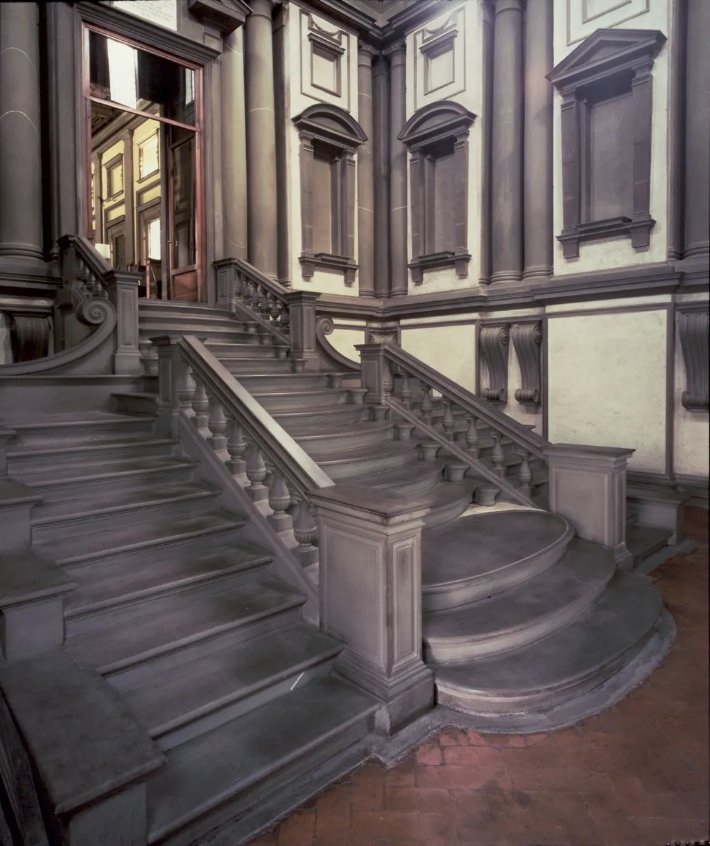 Um encontro com um espaço renascentista de Florença, durante uma viagem formativa à Itália em 1950, permaneceria na imaginação de Mark Rothko por muitos anos. O vestíbulo da Biblioteca Laurenciana, projetado por Michelangelo, é uma câmara compacta e ao mesmo tempo monumental, dominada por uma dramática escadaria em pedra cinza fria. Íntima e imponente ao mesmo tempo, a arquitetura transforma a experiência do visitante em uma espécie de confronto emocional. Rothko explicaria mais tarde que o impacto psicológico do espaço refletia exatamente o efeito que buscava em suas pinturas. Segundo ele, Michelangelo havia alcançado o tipo de sensação que procurava provocar, a ideia de estar aprisionado em um lugar onde só resta confrontar o espaço ao redor.