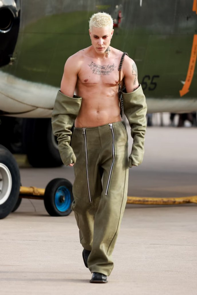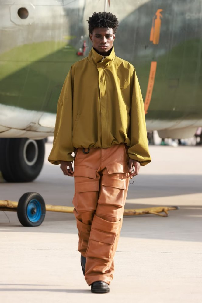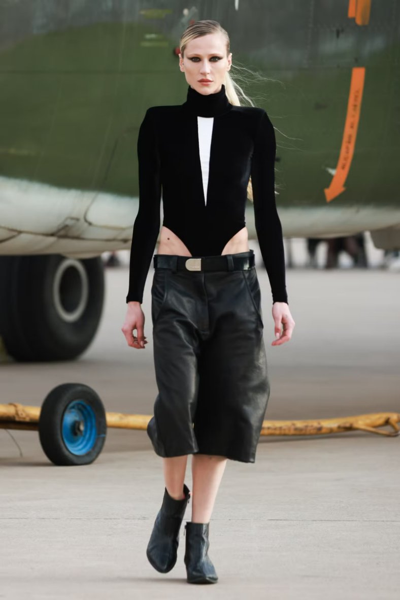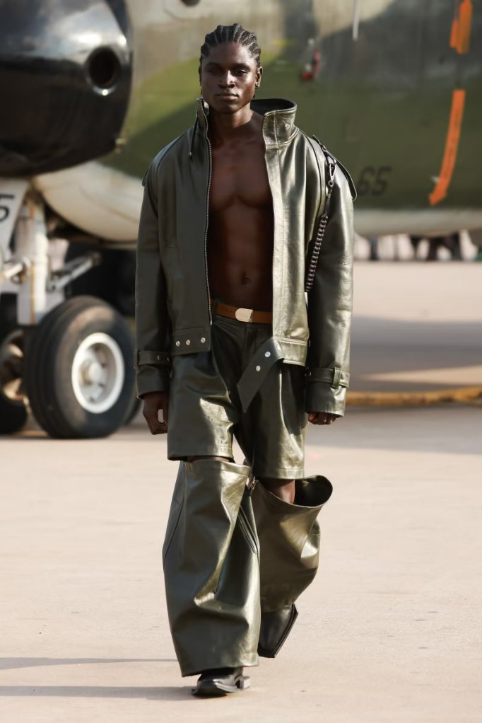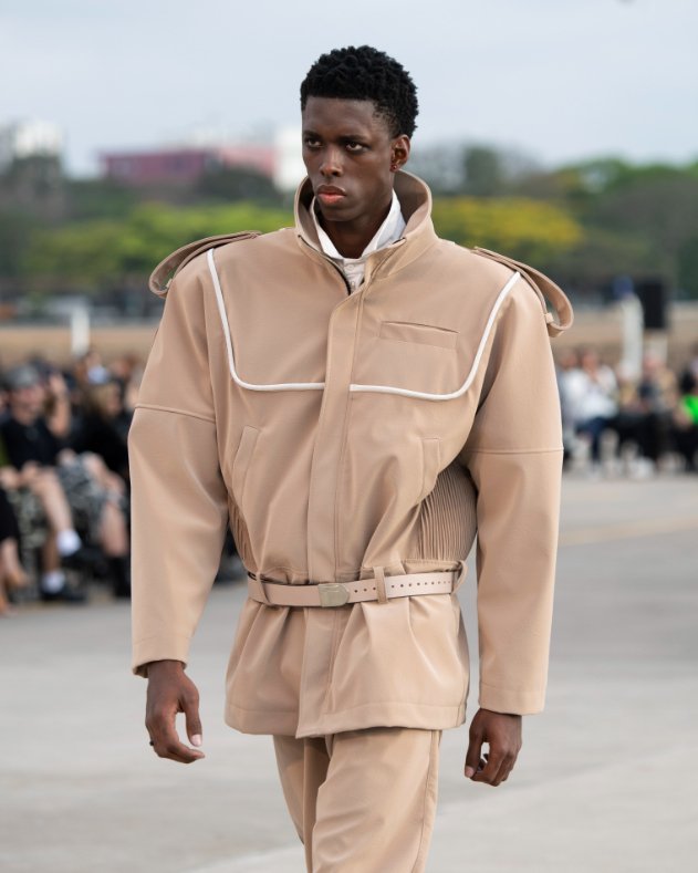 A escolha do Campo de Marte não foi apenas cenográfica. Em torno de uma aeronave militar similar às usadas pela Força Aérea Brasileira, a coleção “Helyx” desfilou em clima de energia bruta e sofisticação urbana. A metáfora do voo foi levada a sério. A marca mostrou que está pronta para alcançar novos horizontes, ampliando sua atuação por meio de multimarcas em todo o território brasileiro e oferecendo peças personalizadas em seu ateliê-showroom na Barra Funda. Inspirada em esportes radicais e na vibração das ruas paulistanas, a coleção apresentou cerca de cinquenta looks com cortes aerodinâmicos, materiais contrastantes e uma identidade fortemente ligada ao universo clubber. Couro, jacquard, chiffon e denim formaram combinações entre rigidez e fluidez, enquanto a cartela de cores evocou uniformes de aviação, oscilando entre off-white, verde oliva e vermelho queimado. O utilitarismo apareceu em jaquetas com múltiplos bolsos, calças com fechos metálicos, parkas plastificadas e tops, reafirmando a estética funcional que acompanha a marca desde sua criação.