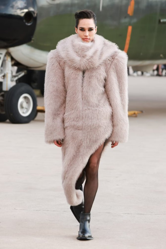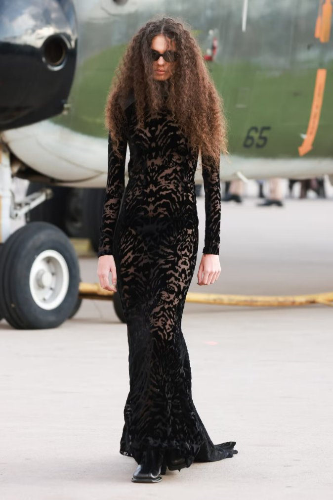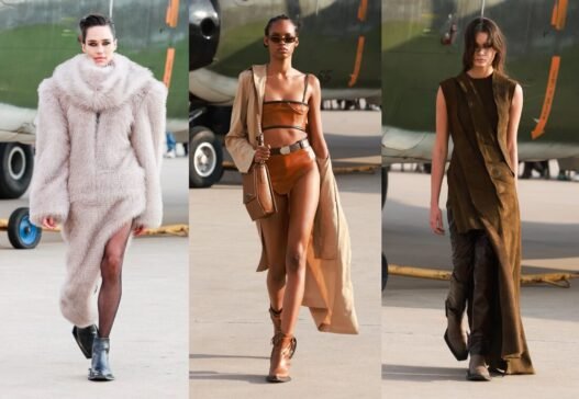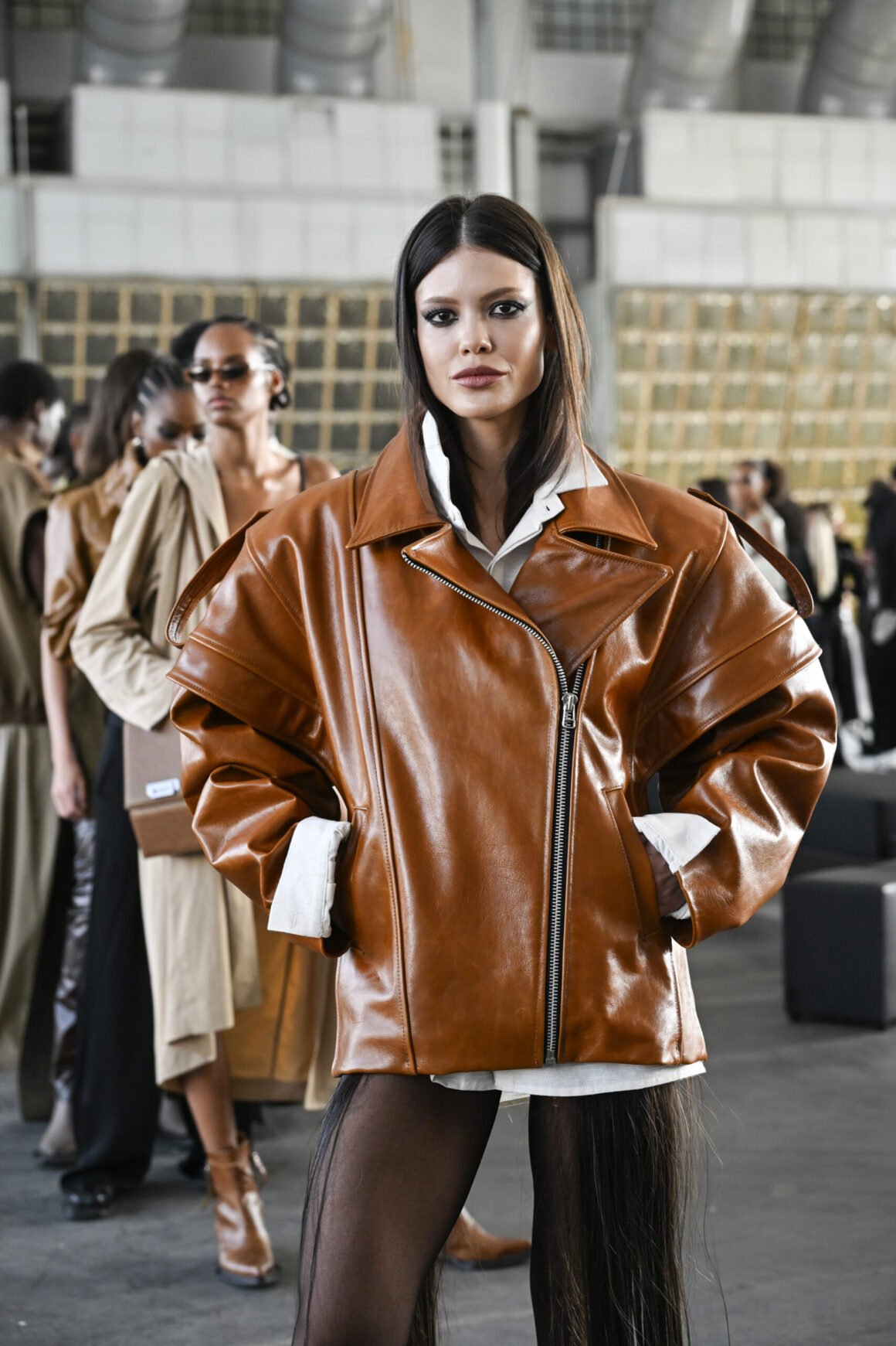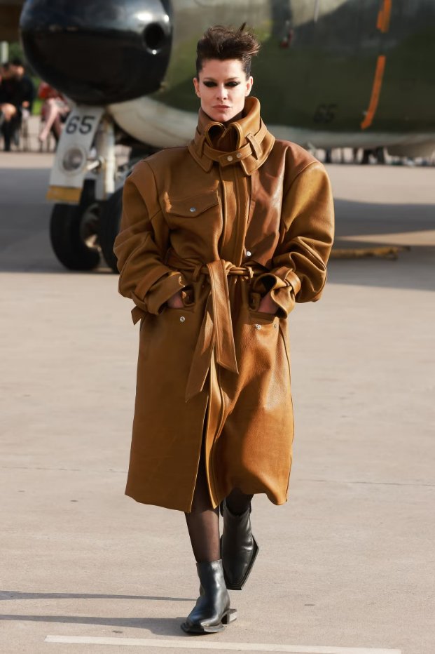 A escolha do Campo de Marte não foi apenas cenográfica. Em torno de uma aeronave militar similar às usadas pela Força Aérea Brasileira, a coleção “Helyx” desfilou em clima de energia bruta e sofisticação urbana. A metáfora do voo foi levada a sério. A marca mostrou que está pronta para alcançar novos horizontes, ampliando sua atuação por meio de multimarcas em todo o território brasileiro e oferecendo peças personalizadas em seu ateliê-showroom na Barra Funda. Inspirada em esportes radicais e na vibração das ruas paulistanas, a coleção apresentou cerca de cinquenta looks com cortes aerodinâmicos, materiais contrastantes e uma identidade fortemente ligada ao universo clubber. Couro, jacquard, chiffon e denim formaram combinações entre rigidez e fluidez, enquanto a cartela de cores evocou uniformes de aviação, oscilando entre off-white, verde oliva e vermelho queimado. O utilitarismo apareceu em jaquetas com múltiplos bolsos, calças com fechos metálicos, parkas plastificadas e tops, reafirmando a estética funcional que acompanha a marca desde sua criação.