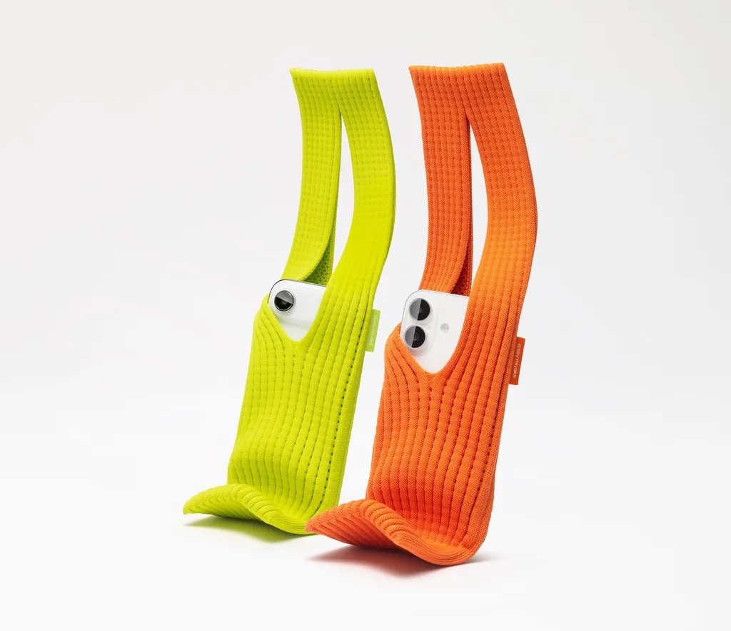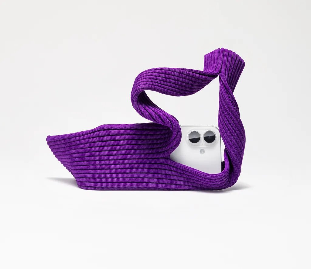O resultado dessa aproximação surge agora como um objeto que une tecnologia e moda sem hierarquias. Criado a partir de uma única peça de malha 3D, o iPhone Pocket segue a filosofia APOC, conceito que Issey Miyake apresentou ao mundo em 1998. APOC, sigla para “a piece of cloth”, inaugura uma lógica de produção em que roupas e acessórios são concebidos como estruturas contínuas, quase esculturas têxteis que abandonam o corte e a costura em favor de uma arquitetura mais fluida. O novo acessório retoma esse princípio em uma peça que lembra uma meia tubular de textura plissada e elástica, pensada para acomodar o iPhone, mas também outros itens essenciais que costumamos carregar nos bolsos ou em bolsas tradicionais.