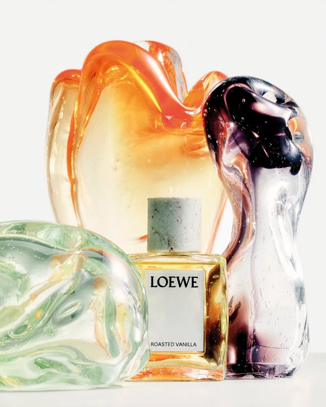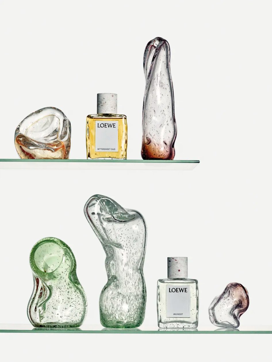Se as composições destacam a capacidade de reinvenção da Loewe, os frascos reafirmam o compromisso da casa com o design e a artesania. Cada perfume surge em um recipiente de vidro soprado à mão, pesado, irregular, pontuado por bolhas formadas naturalmente durante o processo. Cada peça é única, carregando marcas do gesto humano que a originou. A tampa de granito finaliza o conjunto com uma materialidade quase escultórica. Em uma prateleira, esses frascos funcionam como objetos de contemplação, transformando a perfumaria em obra, e não apenas em aroma.