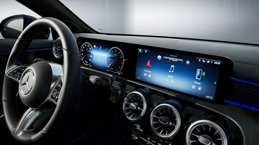 O painel é dominado por um conjunto digital composto por duas telas de 10,25 polegadas integradas sob uma única superfície de vidro. Esse layout cria uma sensação de amplitude e modernidade, aproximando o CLA de modelos superiores da marca. O sistema MBUX, centro da experiência digital, oferece conectividade completa e interação intuitiva. O assistente de voz responde a comandos naturais, permitindo ajustar configurações do veículo sem a necessidade de interação física com botões. É possível controlar temperatura, iluminação interna, navegação e diversos outros recursos com comandos simples, criando uma experiência mais fluida e menos invasiva.