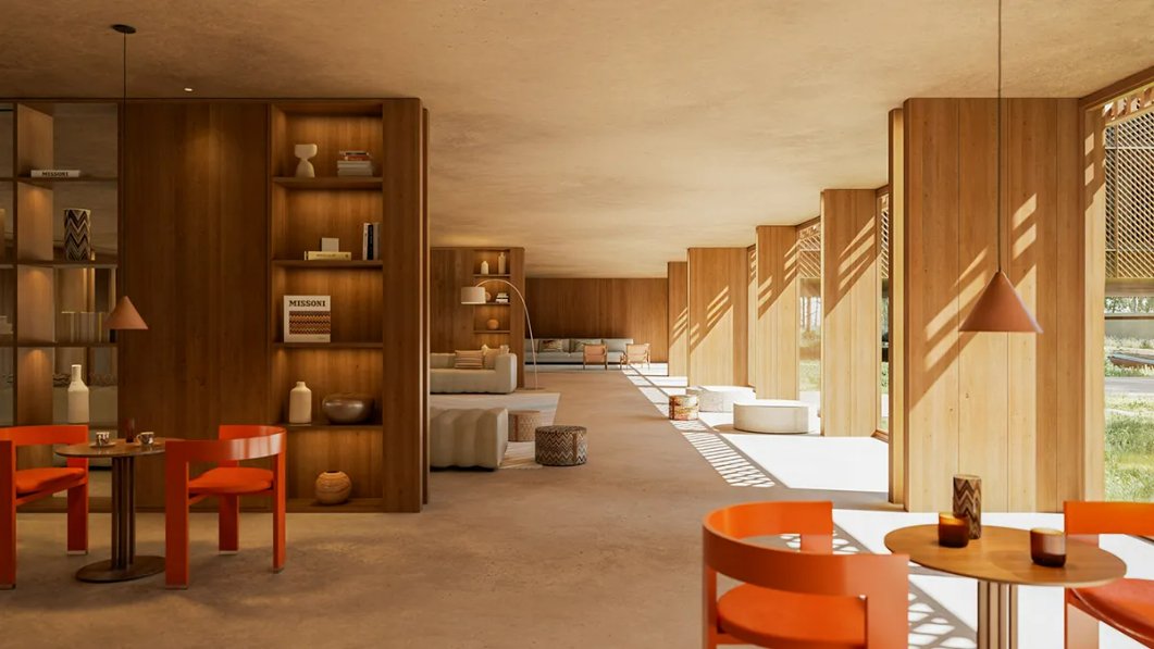 A Missoni assina os interiores das áreas de hospitalidade e das vilas com serviços, inserindo padrões, texturas e paletas reconhecíveis da marca. O projeto também revisita ícones do design português, como a poltrona de Daciano da Costa, reeditada com novos tecidos desenvolvidos exclusivamente para o empreendimento.