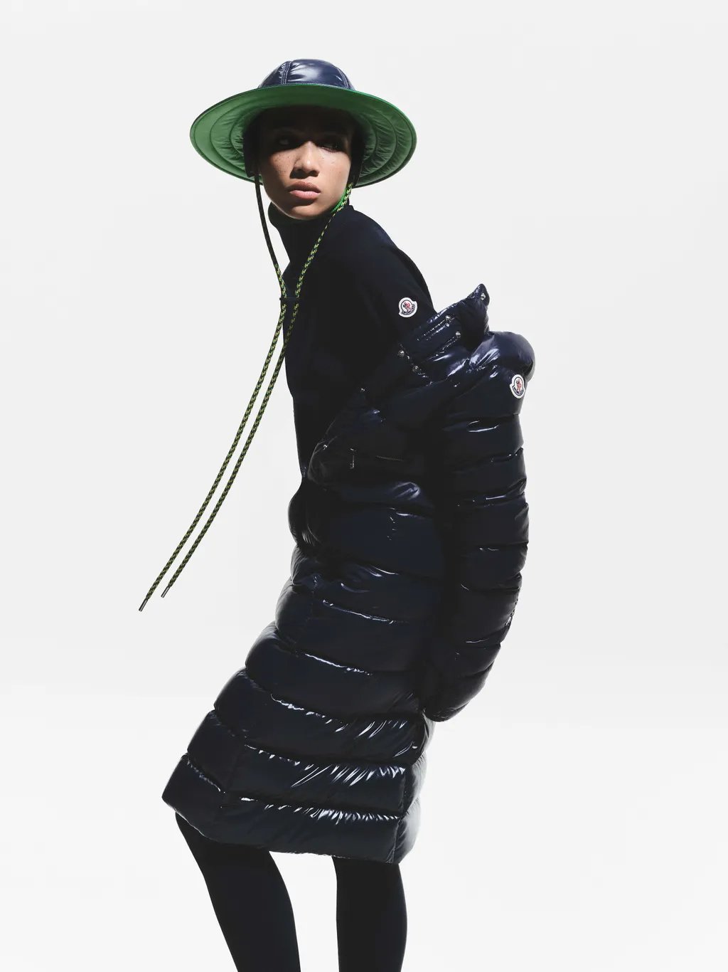 A inspiração vem de um ícone do arquivo da Moncler, a jaqueta Karakorum, criada em 1954 para a histórica ascensão italiana ao K2. O acolchoado volumoso, marca registrada da peça original, reaparece reinterpretado em shorts, saias e na própria capa, conectando passado e presente, performance e expressão.