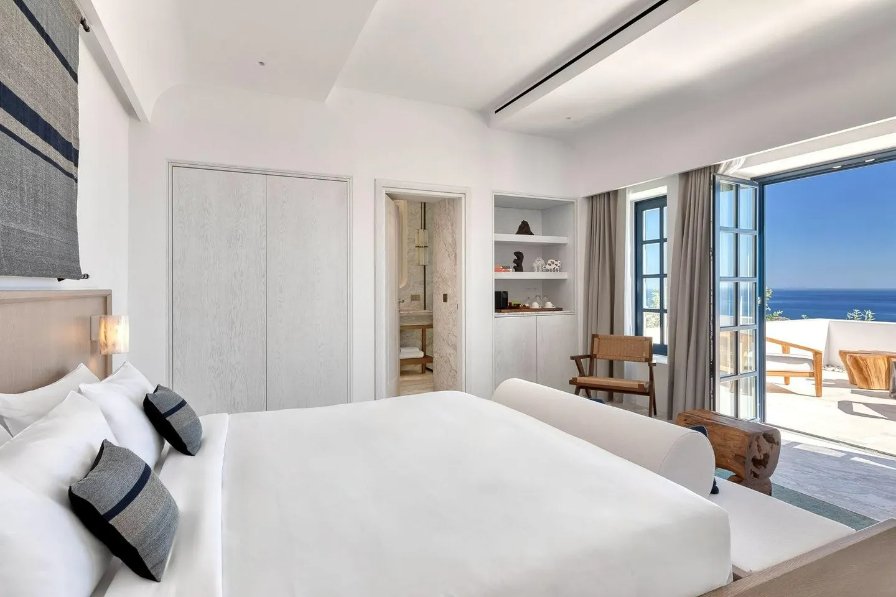 Nos interiores, o design combina tradição e contemporaneidade. Os quartos evocam o espírito das vilas de Santorini, com tetos curvos e paredes de travertino. O mobiliário artesanal, as cadeiras italianas Morelato e as luminárias de alabastro do estúdio francês Atelier Alain Ellouz reforçam a textura sensorial do espaço. Ao abrir as janelas pintadas à mão, o hóspede sente o vento leve percorrer o ambiente enquanto observa, ao longe, a silhueta da ilha de Anafi.