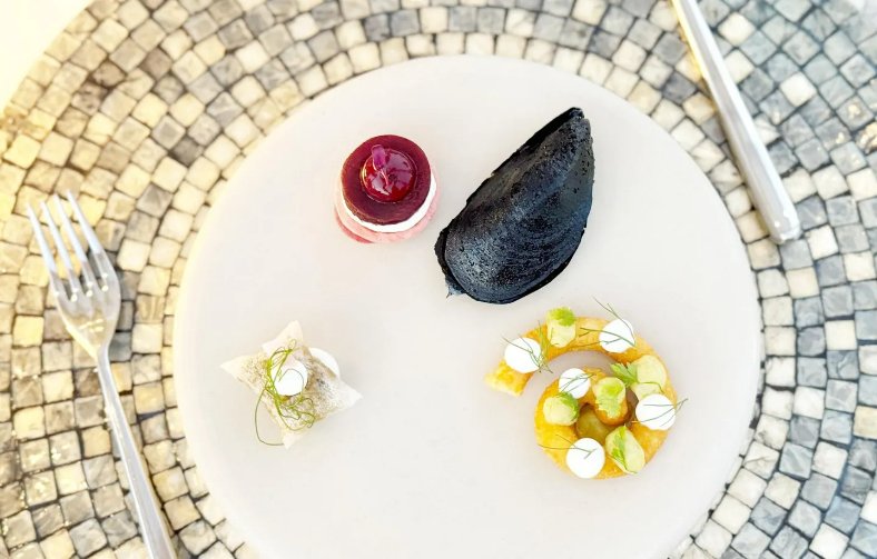 A experiência gastronômica é outro ponto de destaque. No restaurante Nectar, o chef Panagiotis Boufis e o sommelier Adonis Vidalis transformam ingredientes locais em uma celebração dos sentidos. O menu degustação de nove tempos traz interpretações criativas da culinária grega, com pratos que variam do marathopita cretense a um macaron de queijo azul e beterraba. O Assyrtiko, vinho branco típico da ilha, é protagonista nas harmonizações e revela a mineralidade única do solo vulcânico. O cordeiro cozido lentamente com purê de topinambur é o ápice de uma refeição que celebra o território e o tempo.