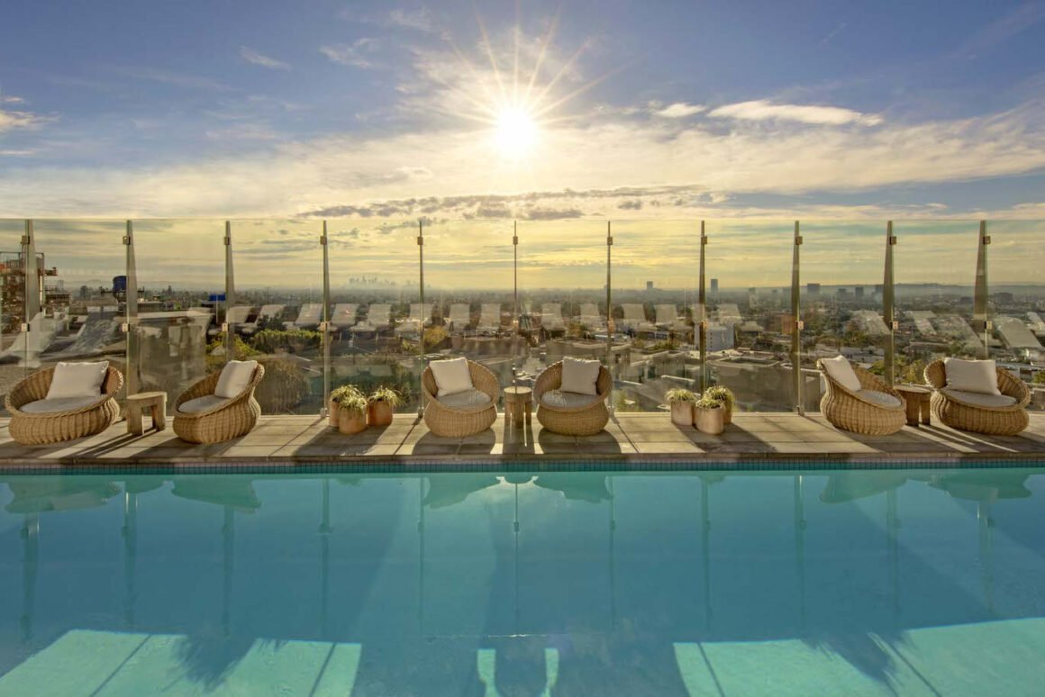 O rooftop, com piscina panorâmica, funciona quase como um clube social elevado, onde coquetéis ao pôr do sol se transformam em um espetáculo cinematográfico. A experiência é complementada pelo restaurante Boxwood, café da manhã incluído, serviço atento e comodidades que tornam o hotel um refúgio sofisticado a poucos minutos do Sunset Strip e de Beverly Hills.