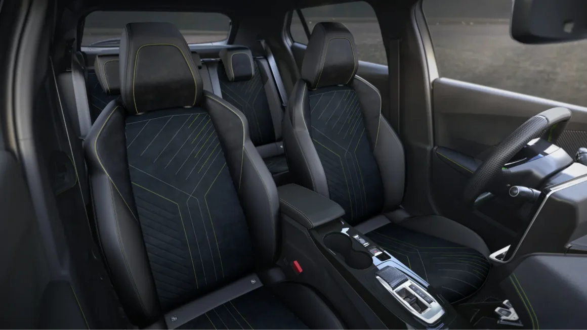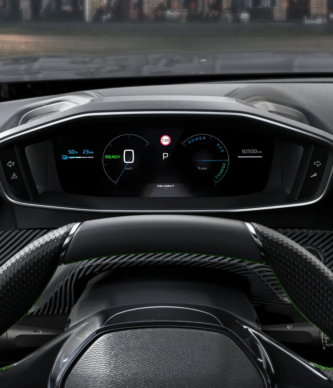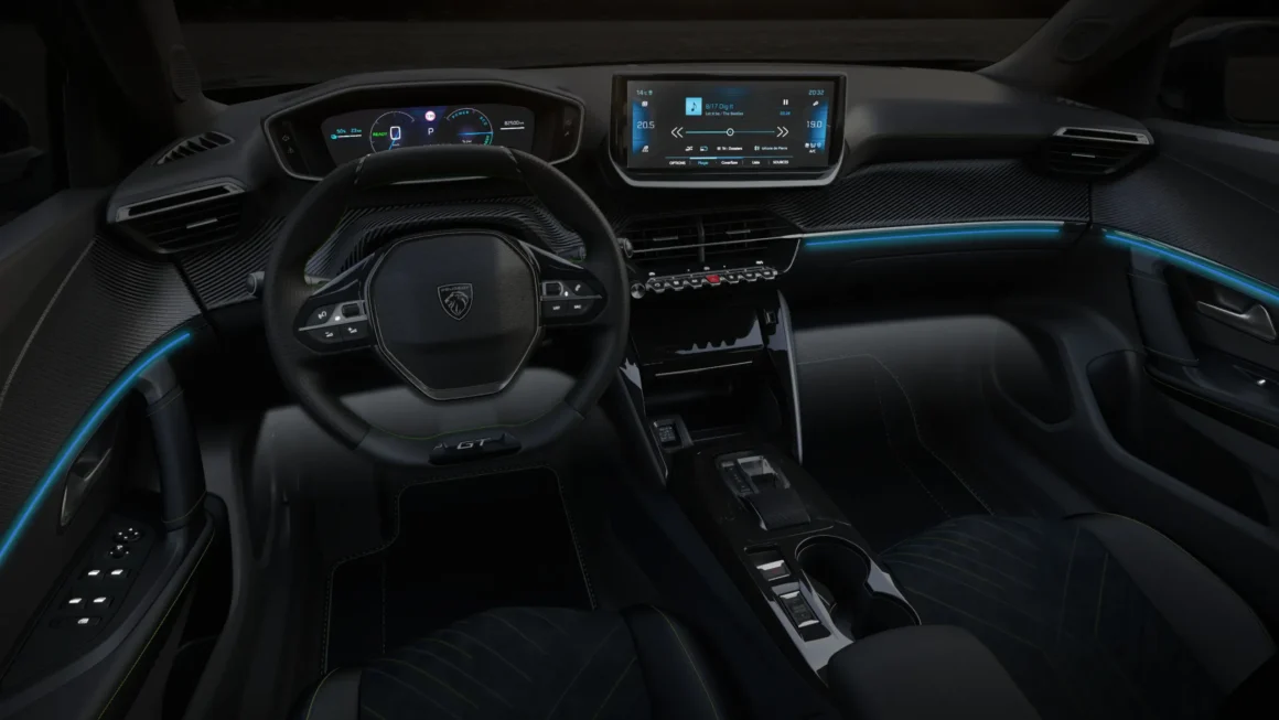 No interior, o e-2008 reafirma o compromisso da Peugeot com o design e a qualidade percebida. O acabamento utiliza materiais macios, detalhes em preto brilhante e elementos que remetem à fibra de carbono, criando uma atmosfera premium. O conceito i-Cockpit segue presente, com volante em posição baixa e quadro de instrumentos elevado, solução que privilegia a leitura rápida das informações, ainda que exija ajustes para não haver interferência do aro do volante. A central multimídia de 10 polegadas é destaque em todas as versões, com boa definição e compatibilidade sem fio com Android Auto e Apple CarPlay. Apesar disso, o sistema peca por transições lentas e interface pouco intuitiva, destoando de um carro com proposta tecnológica avançada. Ainda assim, a possibilidade de personalização de atalhos e o botão de retorno à tela inicial amenizam parte dessa limitação.