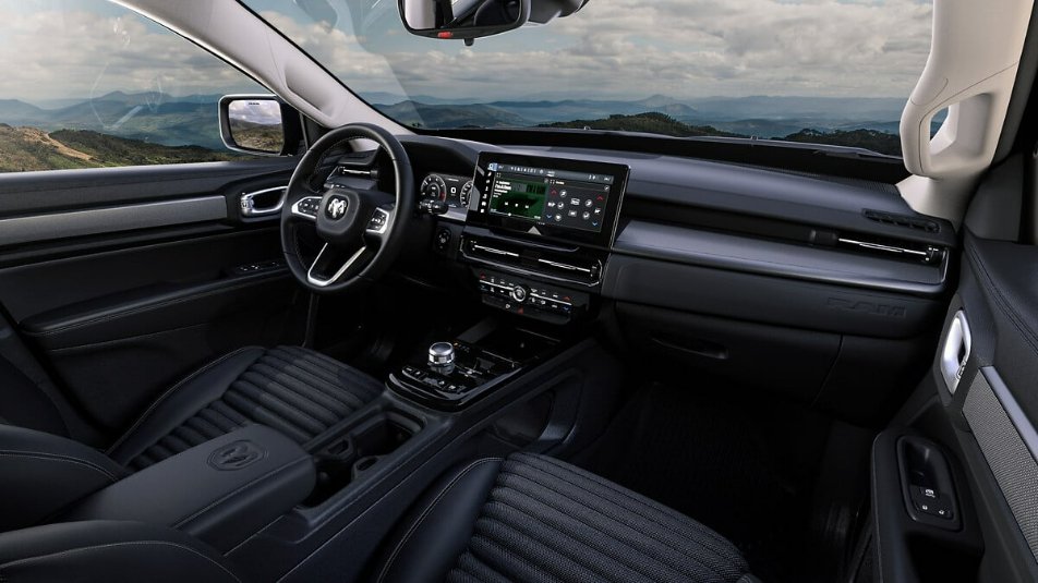 Por dentro, a Rampage Rebel surpreende quem espera o tradicional interior austero de uma picape. O ambiente é refinado, tecnológico e confortável. O painel digital de 10,3 polegadas e a central multimídia vertical de 12,3 polegadas dominam a cabine, oferecendo conectividade completa via Android Auto e Apple CarPlay sem fio. Há carregador por indução refrigerado, seis portas USB (três delas tipo C), chave presencial, partida remota e ar-condicionado digital de duas zonas. Os bancos com revestimento premium e costuras contrastantes, o volante multifuncional revestido em material macio e o console central iluminado elevam o padrão interno a um novo patamar. É uma picape que convida a dirigir longas distâncias com conforto de primeira classe.