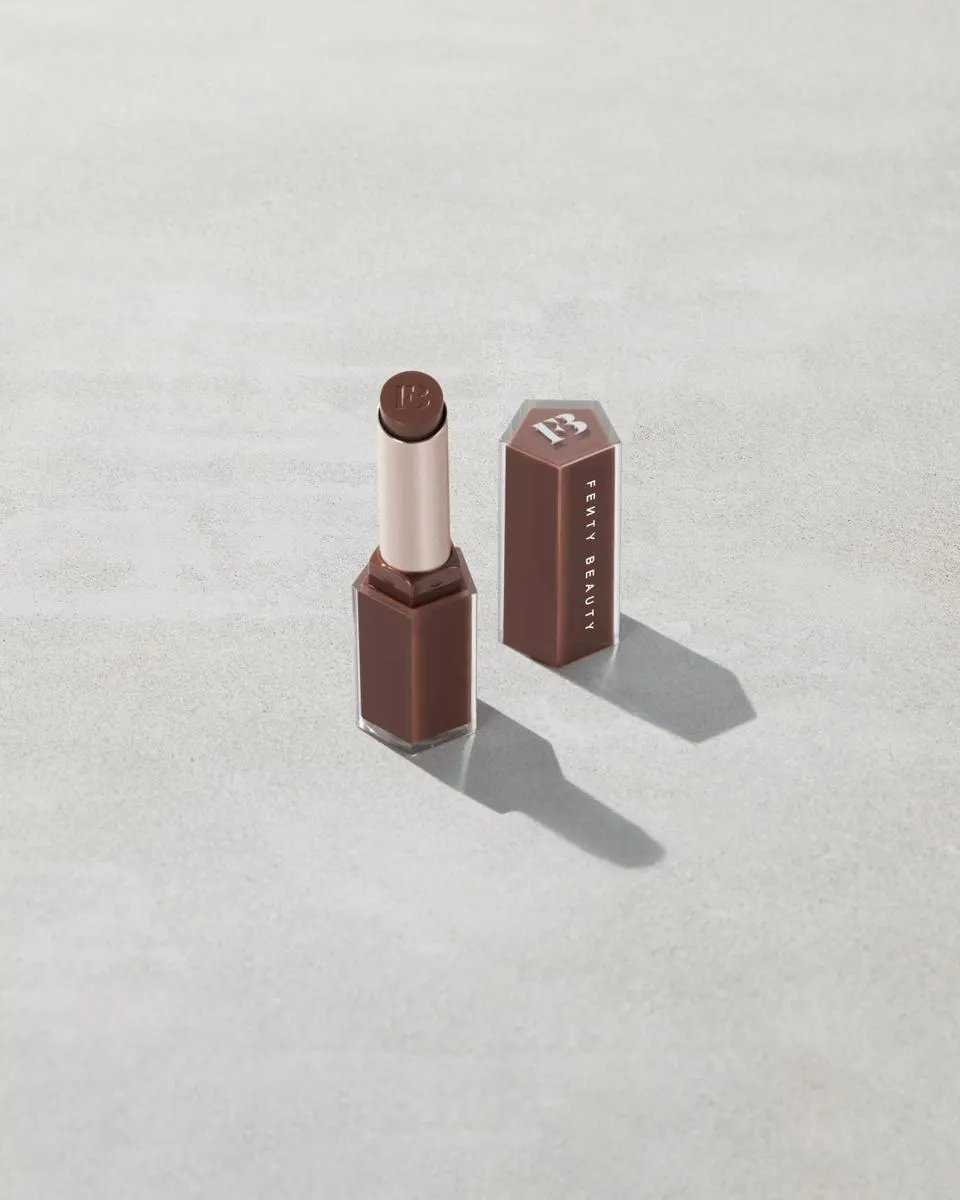 O processo começa com um lápis labial de subtom frio, utilizado para estruturar o contorno com precisão quase invisível. O objetivo não é criar contraste, mas sim definir e valorizar a forma natural dos lábios. O acabamento soft matte garante sofisticação discreta e longa duração, criando uma base estável para a etapa seguinte. Em vez de recorrer a um batom opaco tradicional, Rihanna aplica um gloss em bastão de alta luminosidade, cuja fórmula combina agentes nutritivos e emolientes que preservam a hidratação e proporcionam um brilho elegante.