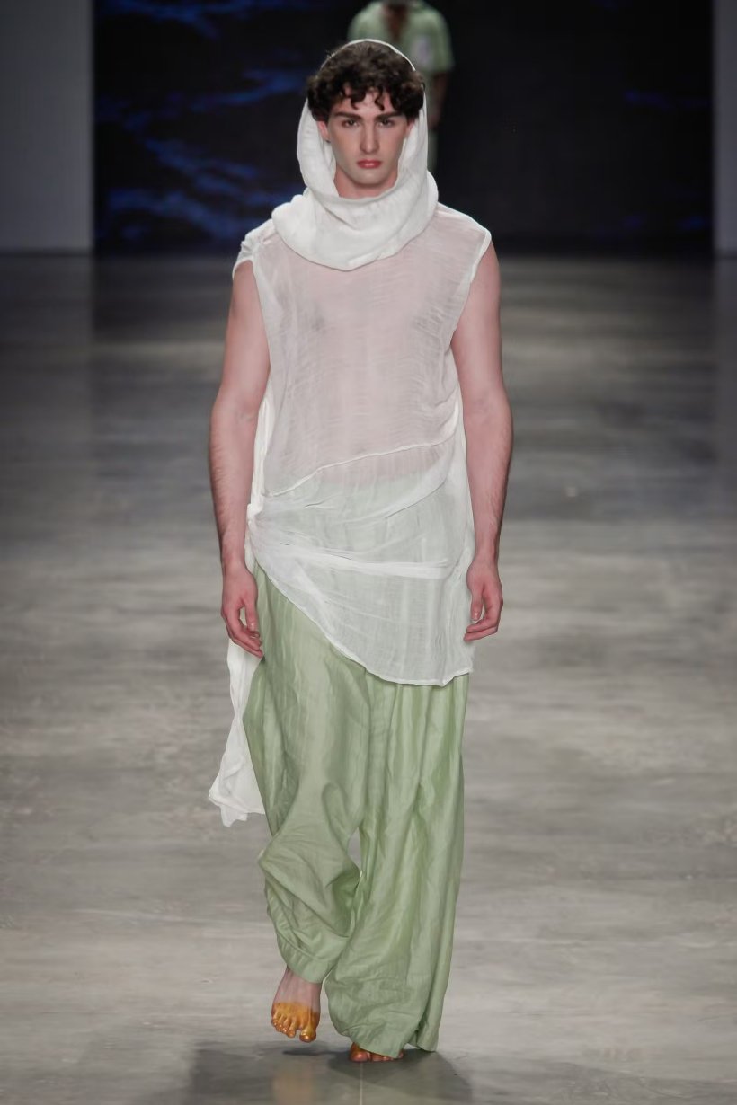 De volta à São Paulo Fashion Week, a Santa Resistência apresentou uma coleção que parece emergir diretamente do encontro entre o mito e o mar. Sob direção criativa de Mônica Sampaio, a marca construiu uma narrativa em torno de figuras femininas aquáticas, sereias, Afrodite, Iara, Atargatis e Iemanjá, para refletir sobre o poder e a fluidez do feminino. Em todas, as águas servem de metáfora para transformação, força e mistério.