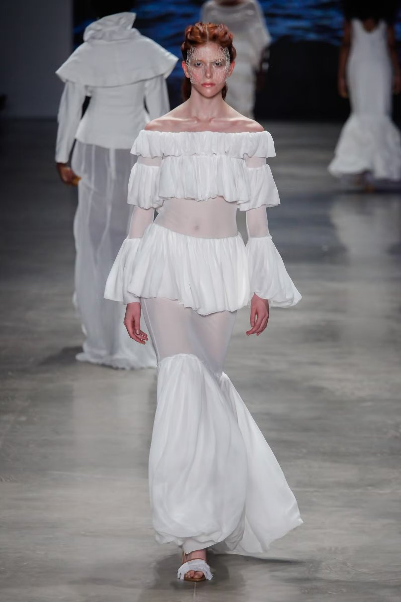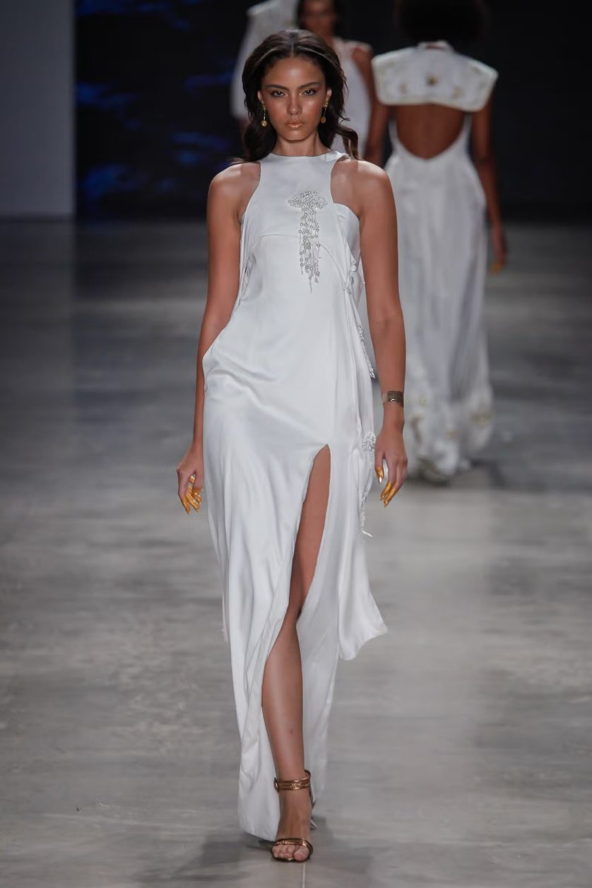 A paleta de cores acompanha essa imersão: azuis que evocam profundidades, brancos que lembram a espuma das ondas, verdes translúcidos, rosas delicados e o dourado que surge como luz sobre a superfície. As silhuetas seguem o mesmo ritmo: sinuosas, fluidas e em movimento constante, com pregas, franzidos e babados que se comportam como correntes marítimas. A leveza dos tecidos ganha contraponto em momentos de estrutura e impacto, como no vestido azul arquitetônico criado em parceria entre Mônica e o estilista Sillas Filgueira, que introduz um diálogo entre forma e fluidez.