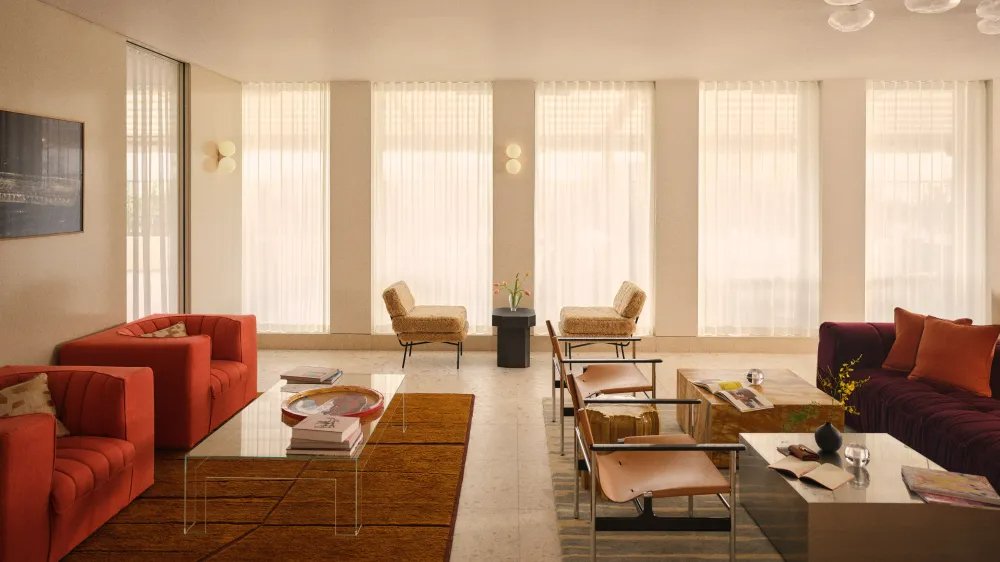 No projeto de interiores, os designers Simone McEwan e Sacha Leong apostaram em materiais como mármore, cortiça e travertino para criar uma atmosfera acolhedora e sofisticada. O mobiliário e as peças decorativas incluem curadoria da galeria The Future Perfect, enquanto as áreas externas recebem móveis da Cassina, acompanhados por tecnologia de áudio da Bang & Olufsen. A arte também ocupa papel central, com mais de 30 obras comissionadas sob direção de Camden Arts Centre.
