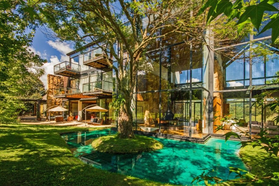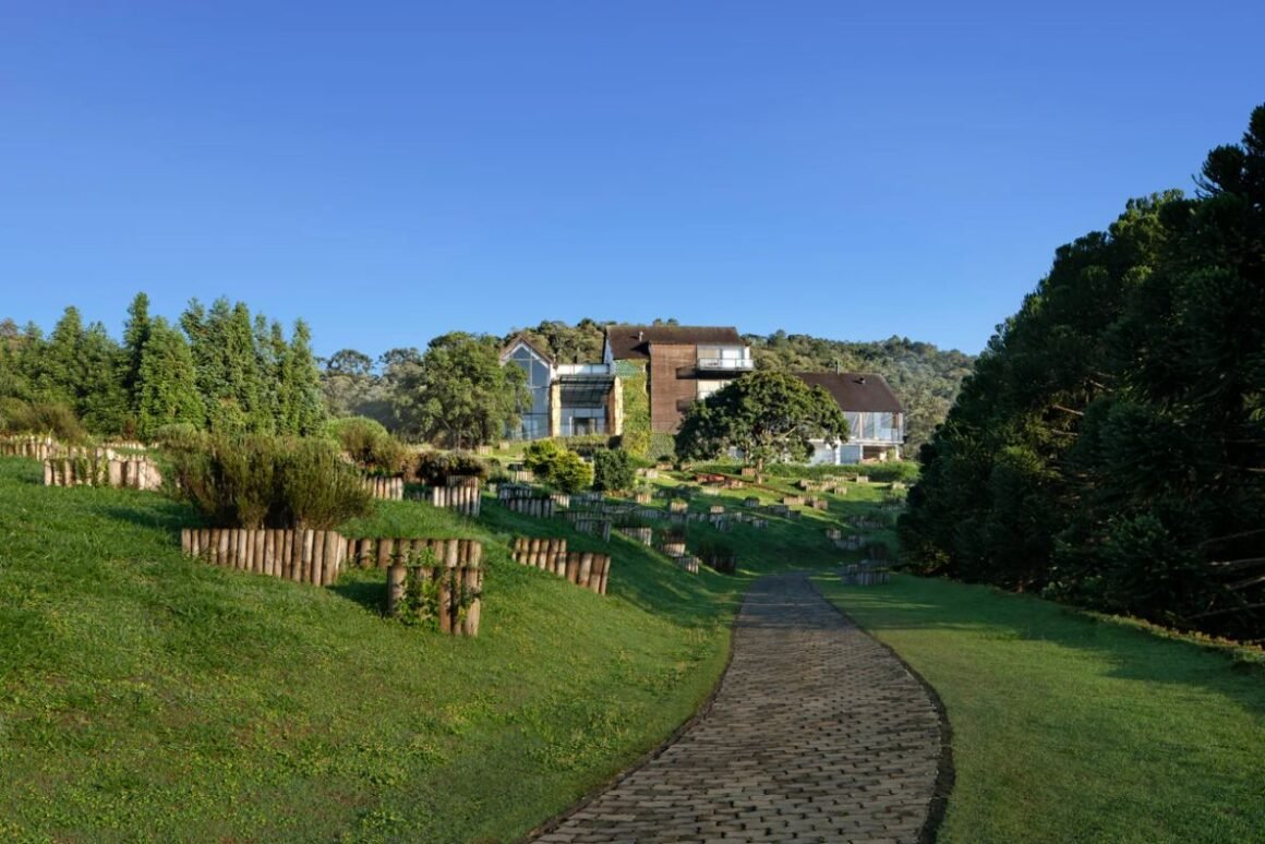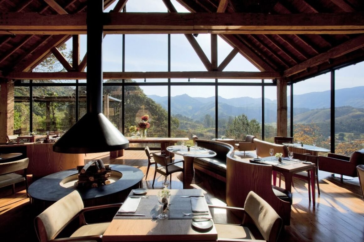Numa área de 7 mil m², o empreendimento a 1.200 metros de altura preza pelo contato com a natureza, apreciada não só do lado de fora, mas também de dentro através de enormes janelas de vidro, varandas e terraços, que ampliam a visão para os vales esverdeados. Sua arquitetura incorpora ainda pedras naturais imensas, ardósia chocolate de uma jazida explorada apenas uma vez a cada 17 meses, aço exposto e vigas de madeira de 120 anos recuperada. Todos esses elementos se unem dentro do design rústico e moderno. Fora de qualquer padrão tradicional do sistema hoteleiro, a lista dos diferenciais do lugar que é referência do novo design brasileiro é extensa. Todas suas torneiras jorram água mineral pura; o blend do café – mistura de diversos grãos, de espécies ou regiões diferentes – foi criado especialmente para o hotel com uma seleção dos melhores grãos nacionais e todos os aromas (dos ambientes aos xampus e creminhos) foram desenvolvidos igualmente com exclusividade.