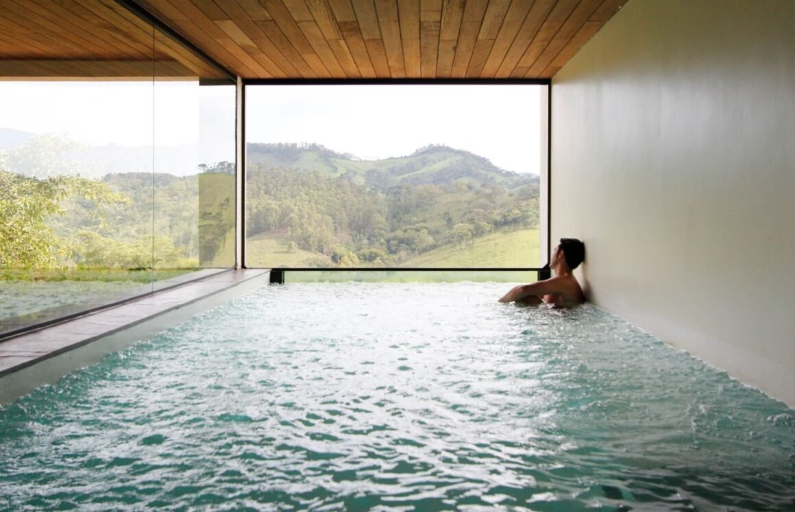 O prédio central da propriedade abriga o restaurante, salão, biblioteca, espaços de convivência e uma piscina externa de água mineral. O spa oferece tratamentos patenteados e conta com uma piscina isotônica coberta, onde são aplicados tratamentos corporais, massagens e uma extensa gama de hidroterapias, saunas seca e úmidas com chuva. São oito espaços de atendimento especializado que utilizam a biodiversidade do Brasil como base, oferecendo alongamentos baseados em movimentos de capoeira, sessões de meditação guiada e até terapias que simulam a chuva da Mata Atlântica. Existe também um programa detox fundamentado em alimentação natural, trilhas pelo Vale dos Mellos e contemplação da floresta. Por sinal, não faltam atividades na natureza, como cavalgadas, passeios de bike, aulas de tênis na quadra do fundo do vale ou ginástica com personal trainer em meio ao bosque que envolve o hotel.  As “burocracias” da hotelaria comum também foram eliminadas, como o check-in, as gorjetas, a assinatura de conta no restaurante e a cobrança por serviços como lavanderia e frigobar. Qualquer dúvida ou necessidade que o hóspede tenha é resolvida por um único ramal de telefone ou diretamente no balcão do bar, com a ajuda dos chamados âncoras – funcionários responsáveis por cuidar das demandas de cada quarto.