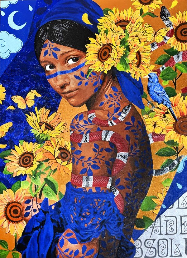 O espaço do Rosewood São Paulo aprofunda a dimensão sensorial da feira ao apresentar as pinturas de Ananda Nahu. Suas composições, marcadas por cores intensas e figuras femininas, constroem imagens que articulam espiritualidade, memória e identidade cultural, evocando referências afro-indígenas e criando um campo visual carregado de símbolos.