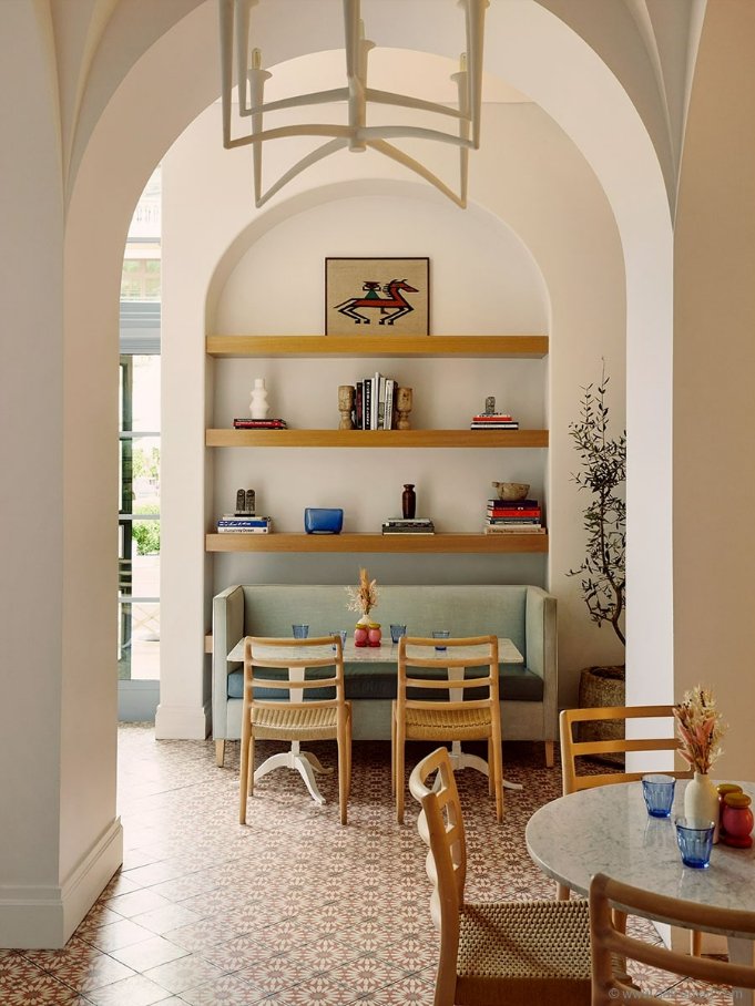 O antigo edifício do Montage Beverly Hills foi completamente reinventado. Sob a direção criativa do designer Bryan O’Sullivan, os interiores ganharam luz, leveza e alma. São 204 quartos e 57 suítes cuidadosamente desenhados, em tons de areia, azul suave e pêssego, decorados com móveis sob medida, obras de arte contemporâneas e acabamentos em mármore e madeira clara. Cada detalhe foi pensado para transmitir serenidade, desde as cortinas translúcidas que filtram a luz dourada da Califórnia até as flores frescas que pontuam discretamente os ambientes.