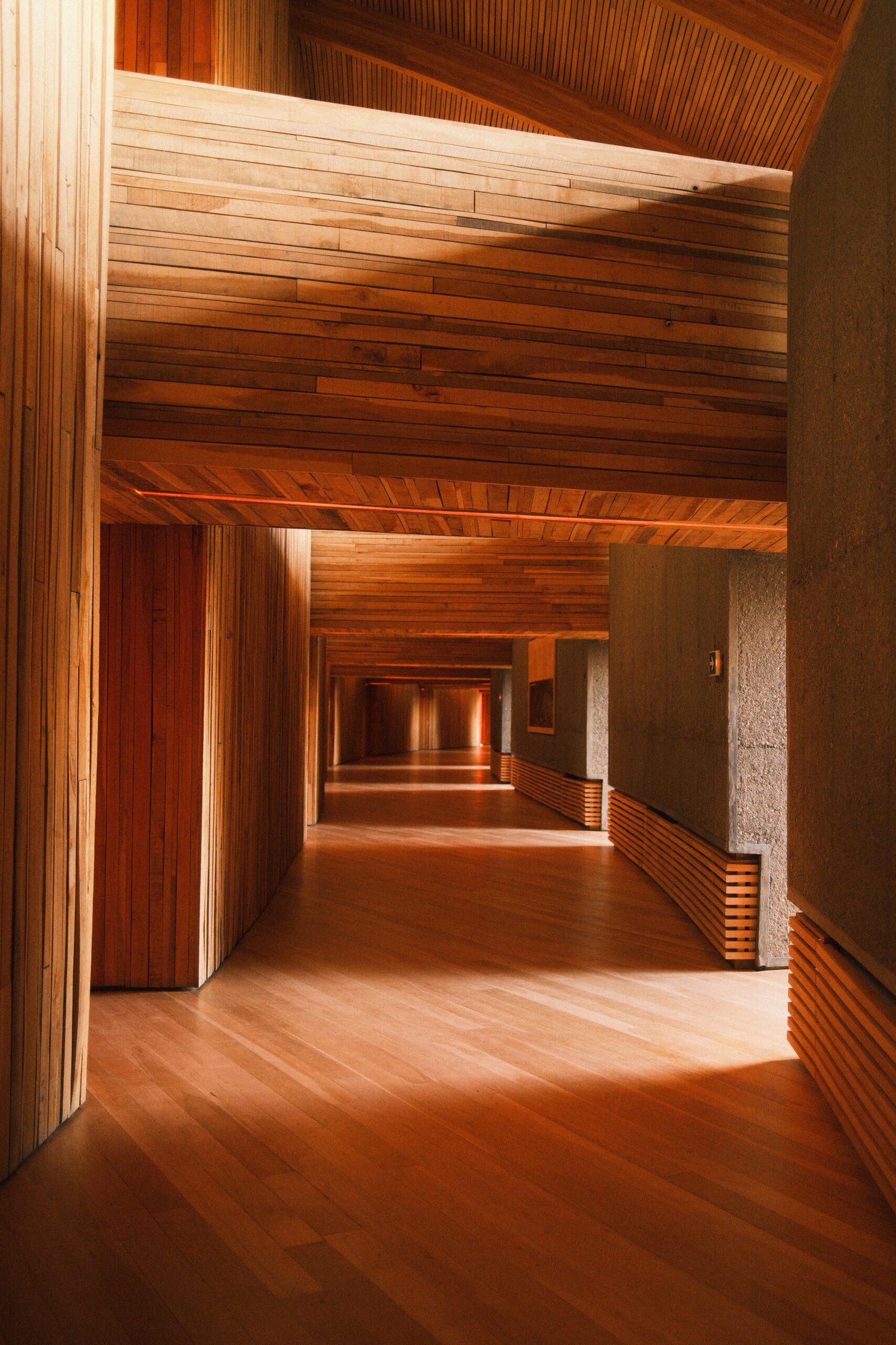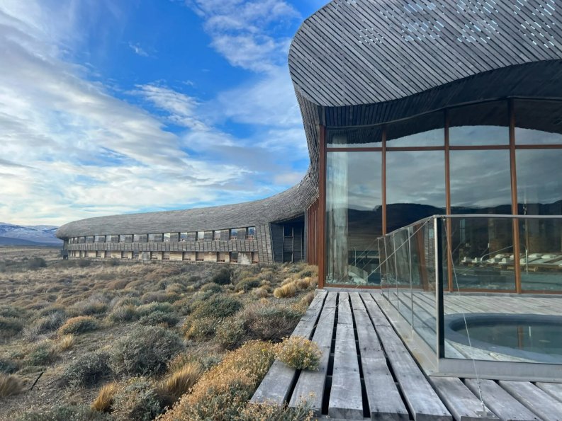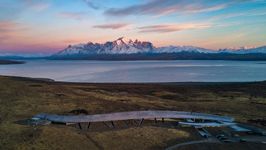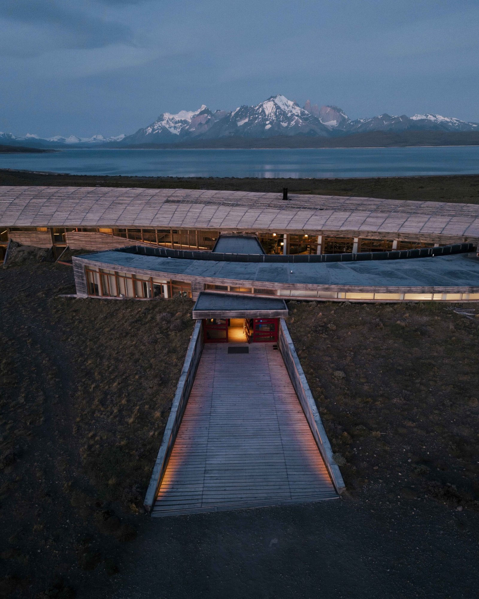 Projetado pela arquiteta chilena Cazu Zegers, o edifício foi pensado para se integrar ao cenário, não para dominá-lo. A estrutura curva, baixa e alongada acompanha o relevo da estepe patagônica e utiliza madeira lenga em seu estado natural, permitindo que o tempo, o clima e o vento deixem suas marcas. De longe, o hotel quase desaparece, confundindo-se com as linhas do terreno. É uma arquitetura que respeita o entorno e entende que, ali, o protagonismo pertence à paisagem.