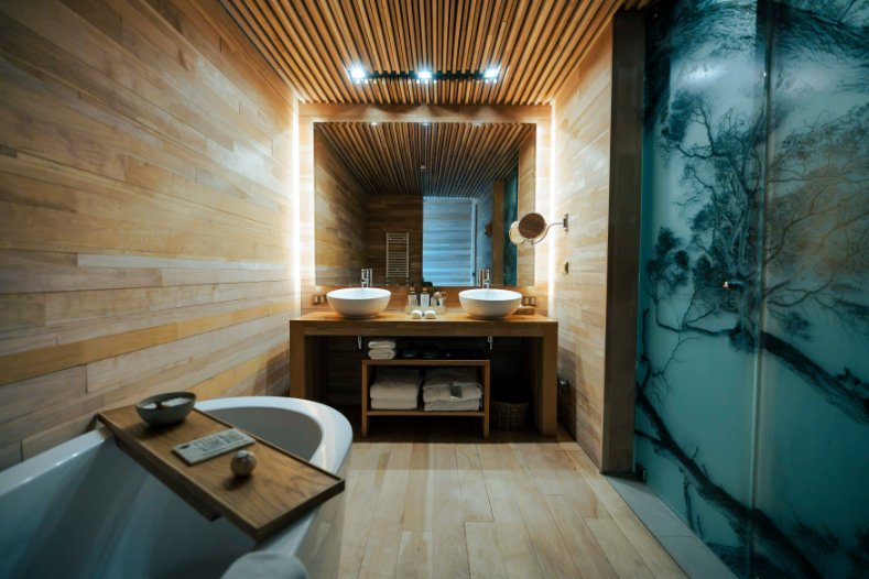 No interior, o mesmo conceito se mantém. O uso contínuo das madeiras claras, combinado a couro, lã e vidro, cria um ambiente acolhedor, orgânico e contemporâneo. O lobby funciona como um grande mirante social, reunindo lareira, bar, biblioteca e áreas de descanso, todas voltadas para o lago e as montanhas. Mesmo com ocupação completa, o espaço transmite tranquilidade, favorecida pela distribuição inteligente dos ambientes e pelo número reduzido de acomodações.