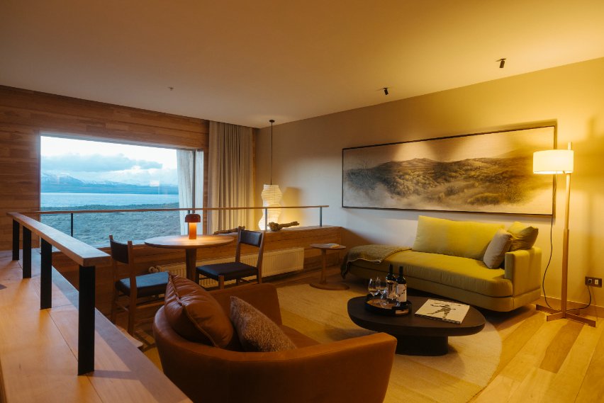 Os quartos seguem uma estética minimalista, sem excessos, mas com atenção rigorosa ao conforto. Todos oferecem vista direta para o Lago Sarmiento e para as Torres del Paine, transformando o cenário em parte ativa da experiência. As janelas amplas enquadram um espetáculo em constante transformação, enquanto a paleta de cores neutras, os materiais naturais e a ausência de televisores incentivam um descanso genuíno, conectado ao ritmo do lugar.