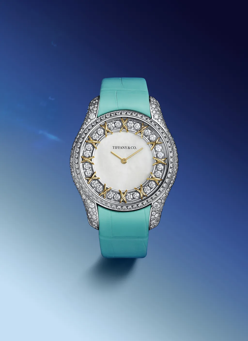 A caixa de ouro branco de 36 mm recebe um engaste snow-set com 413 diamantes, criando uma superfície contínua de brilho que dialoga com o fundo da caixa, gravado com um padrão sunburst inspirado no broche Floral Arrows de Schlumberger. A pulseira de jacaré em Tiffany Blue e a fivela em ouro branco com diamantes completam o conjunto com coerência estética e refinamento.