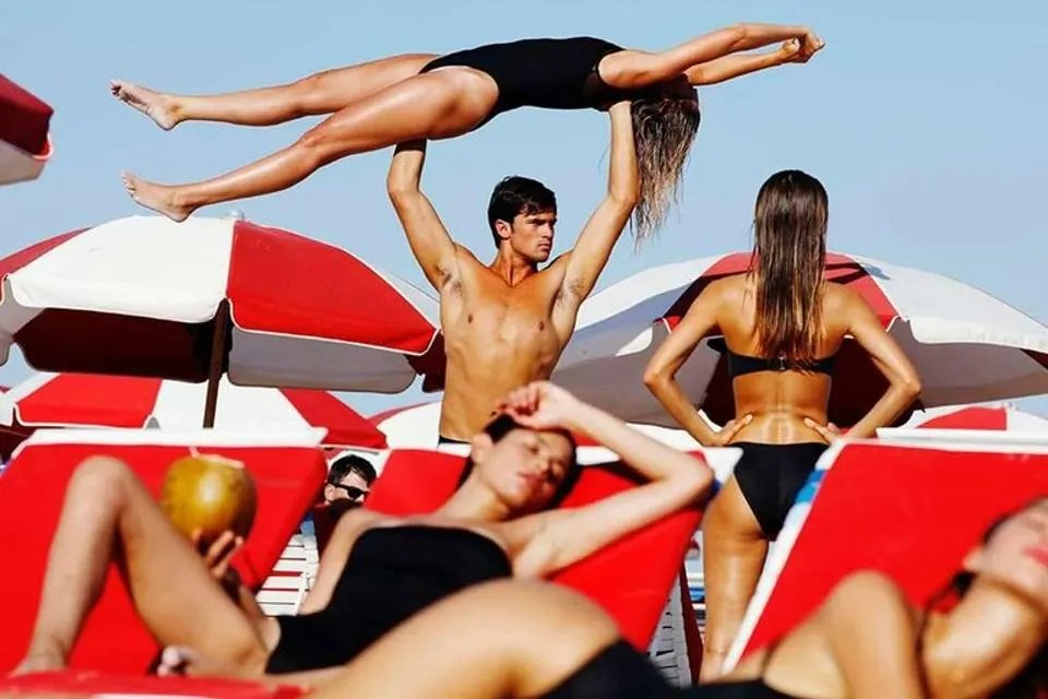 O trabalho de Tony Kelly é imediatamente reconhecível pelo uso intenso de cores saturadas, composições gráficas fortes e situações que flertam com o absurdo. Biquínis, saltos altíssimos, joias reluzentes e corpos esculturais aparecem como símbolos de um luxo exagerado, tratado sempre com ironia e leveza. Há sensualidade em abundância, mas também irreverência, quase como se cada fotografia convidasse o espectador a rir junto com a cena que se desenrola diante de seus olhos. Esse equilíbrio entre erotismo, humor e crítica visual transforma suas imagens em comentários sutis sobre a cultura do consumo, da autoexposição e do desejo contemporâneo.
