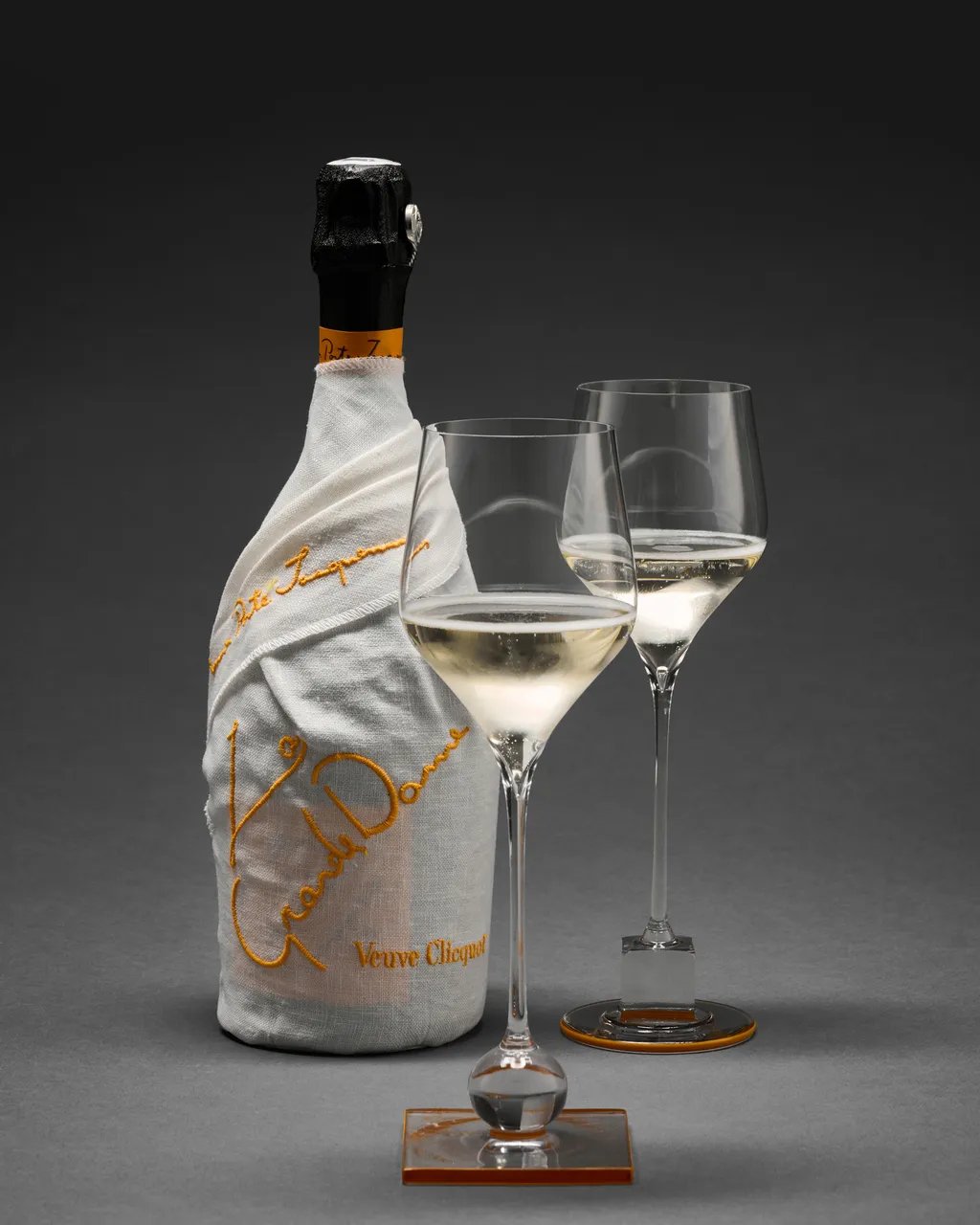 A intervenção do designer começa pela própria garrafa, envolta em uma tela branca Toile du Marais. O gesto remete à elegância despretensiosa de tecidos antigos secando ao sol, evocando um imaginário doméstico e afetivo que contrasta com a aura solene normalmente associada às grandes cuvées. Sobre a superfície clara, o bordado amarelo assinala a safra e estabelece um elo direto entre as identidades visuais de Jacquemus e da Veuve Clicquot, que adotou a cor como assinatura desde o século XIX. Aqui, o amarelo deixa de ser apenas código gráfico e se transforma em metáfora de calor, luz e vitalidade.