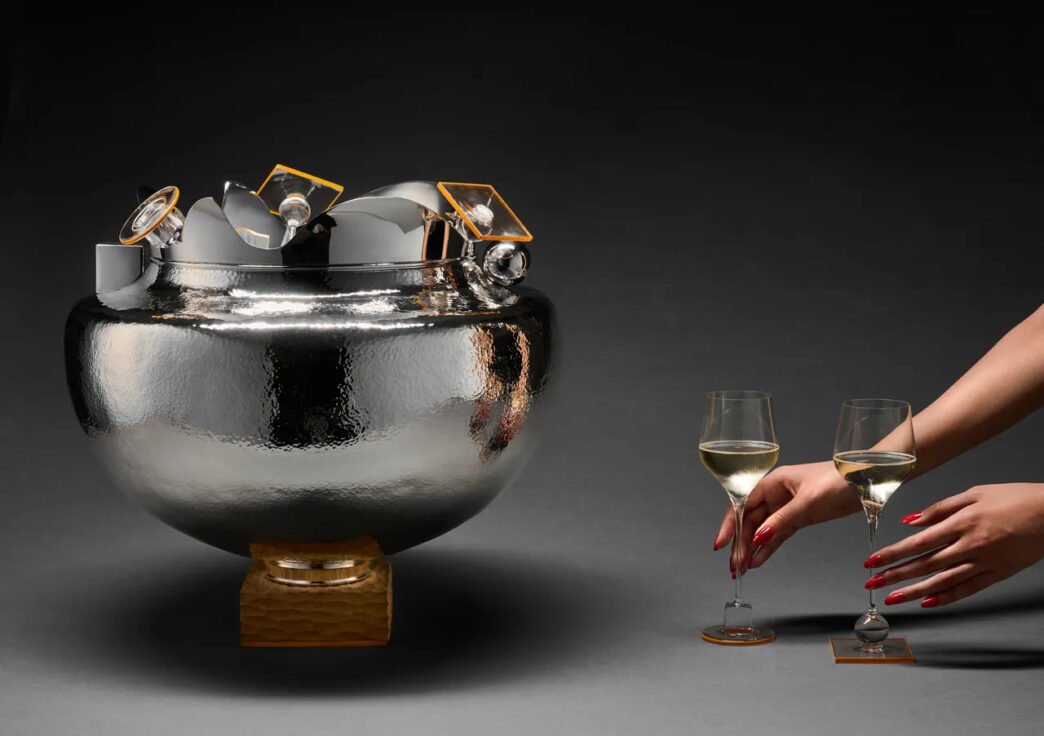Produzido sob encomenda e em edição limitada, o rafraîchissoir foi realizado pela artesã Camille Orfèvre, reconhecida com o título de Meilleur Ouvrier de France. Cada exemplar exige mais de quarenta horas de trabalho manual e técnicas tradicionais de polimento, gravação e laqueação. O resultado é um objeto que transcende a função utilitária e se aproxima do território da arte aplicada, celebrando a excelência artesanal como valor central.