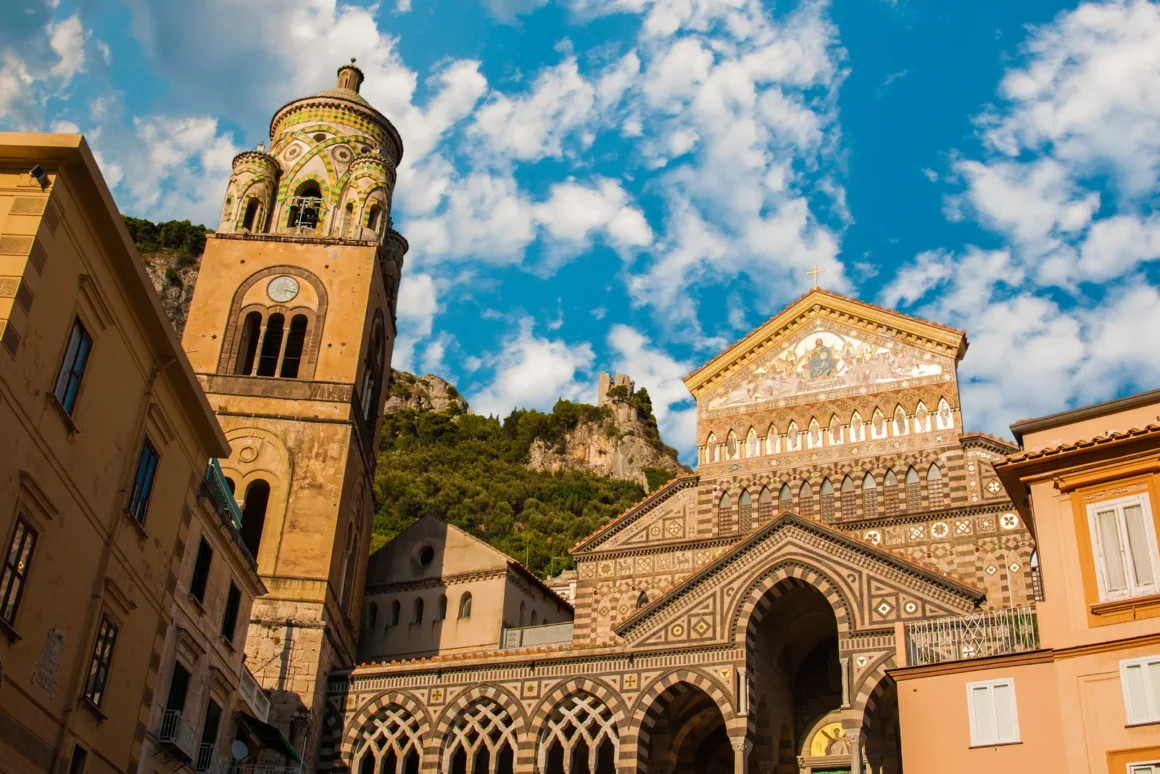 Amalfi já foi uma poderosa república marítima, rivalizando com Veneza e Pisa entre os séculos IX e XII. Hoje, o turismo domina, mas o passado ainda resiste no Valle dei Mulini, onde antigos moinhos de papel lembram sua vocação artesanal. No coração da cidade, a Piazza del Duomo concentra a vida social diante da catedral de Sant’Andrea, com sua fachada em estilo normando-árabe e portas de bronze moldadas em Constantinopla no século XI.